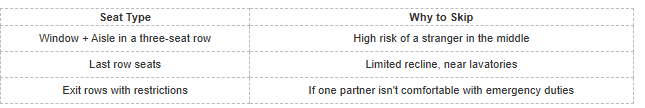If you both want extra legroom without the exit row restrictions, bulkhead seats offer space to stretch.