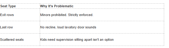 Seat TypeWhy It's ProblematicExit rowsMinors prohibited. Strictly enforced.Last rowNo recline, loud lavatory door soundsScattered seatsKids need supervision sitting apart isn't an option
