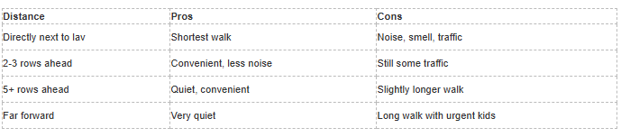 Proximity to lavatories – Quick bathroom access saves sanity.