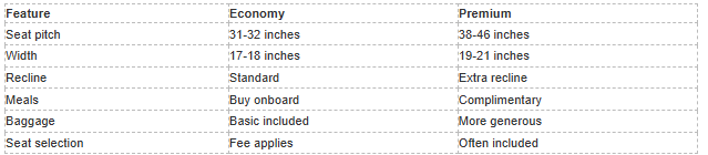 Different seat categories exist – Standard seats, preferred seats (closer to the front), and "Stretch" seats with extra legroom.
