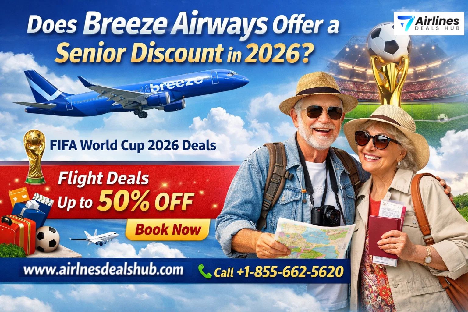 Yes, we anticipate that in the lead-up to and during the FIFA World Cup 2026, Breeze Airways will release promotional codes offering Flight deals up to 50% off. Seniors should sign up for newsletters and contact us to be the first to know about these Breeze Airways Senior Travel Offers for World Cup travel.