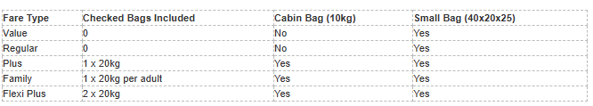 Standard Ryanair fares (Value & Regular): No checked bags included. You only get a small 40x20x25 bag ryanair (under the seat). That is it.